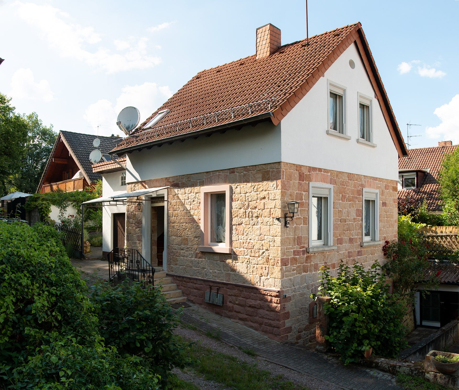 Das liebevoll renovierte Sandsteingebäude besticht durch sein außergewöhnliches Ambiente. Im Erdgeschoss befinden sich der Wohn-Essbereich mit Einbauküche und Kaminofen sowie ein modernes Badezimmer. Im Obergeschoß sind zwei Schlafzimmer mit Doppelbetten, ein Aufenthaltsraum und ein Gäste-WC. Autos können direkt vor dem Haus geparkt werden; für Fahrräder ist eine Unterstellmöglichkeit vorhanden. Waschmaschine und Trockner befinden sich im Untergeschoss. Zum Haus gehört ein eigener Garten mit Liegewiese, Kräutergarten, Gartenlaube und Grillmöglichkeit. Vier Restaurants sind im Umkreis von 500 Metern zu Fuß erreichbar.